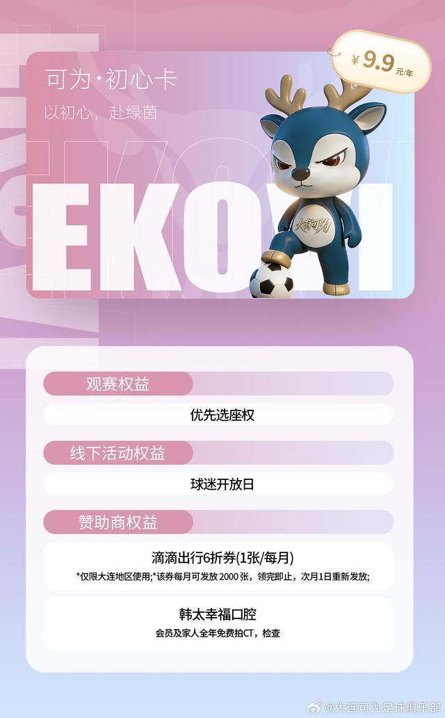 北京时间3月12日,据大连可为官方消息,大连可为官方小程序正式上线,俱乐部还公开招募可为大会员。大连可为共推出五档不同价位的会员,各档位卡种均搭配观赛、周边、线下活动、青训体验及赞助商专属权益,且权益随卡种价位提升逐步升级。初心卡:9.9元/年同行卡:99元/年逐风卡:666元/年笃信卡:999元/年荣耀卡:1999元/年...