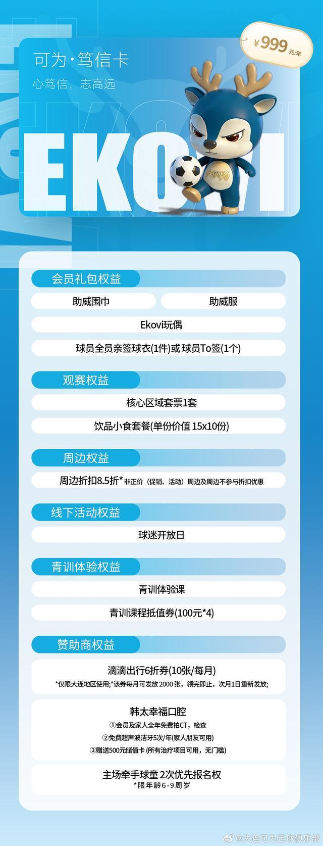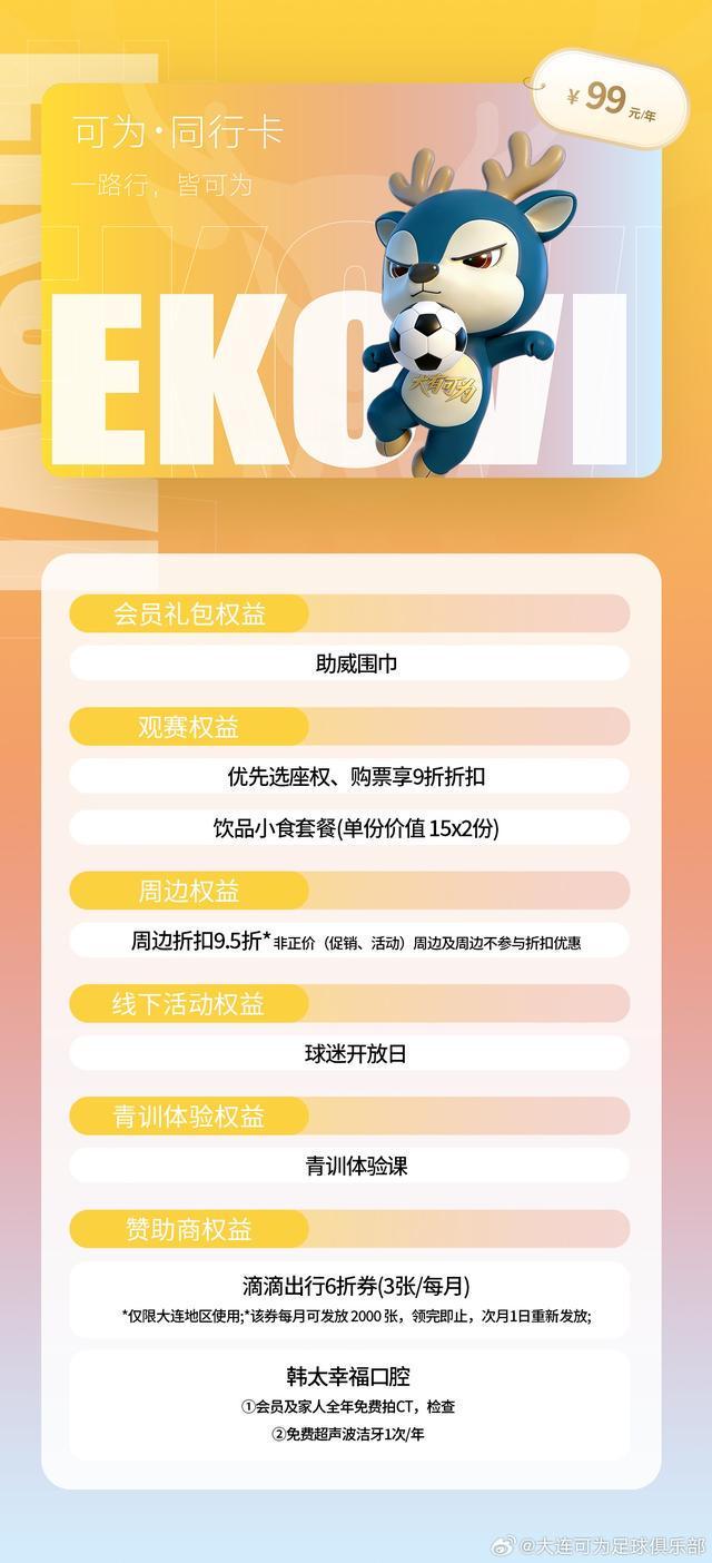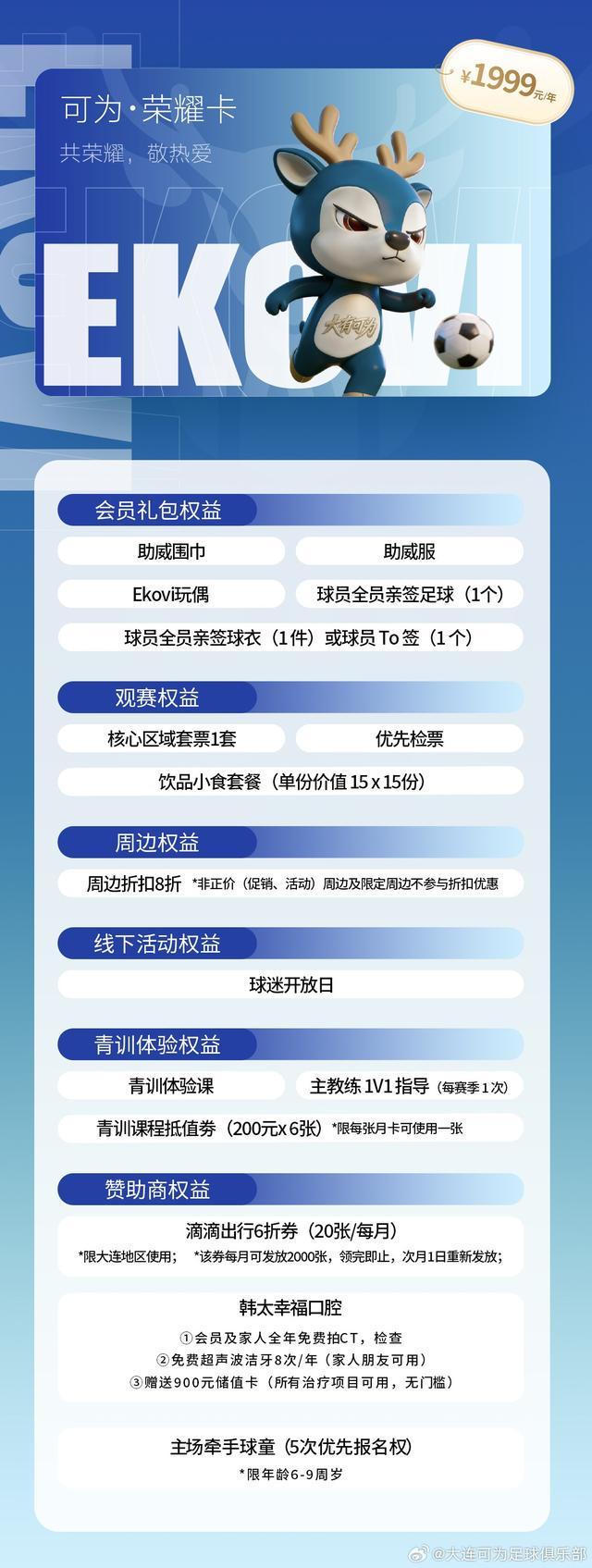 大连可为共推出五档不同价位的会员,各档位卡种均搭配观赛、周边、线下活动、青训体验及赞助商专属权益,且权益随卡种价位提升逐步升级。